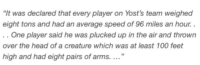 One Morgantown paper had a little fun with the game, writing <quote> “It is declared that every player on Yost’s team weighs eight tons and has an average speed of 96 miles per hour. They are said to breathe forth smoke and flames and of superhuman strength and cunning. One player says he was plucked up in the air and thrown over the head of a creature one hundred feet high with eight arms.”<unquote>